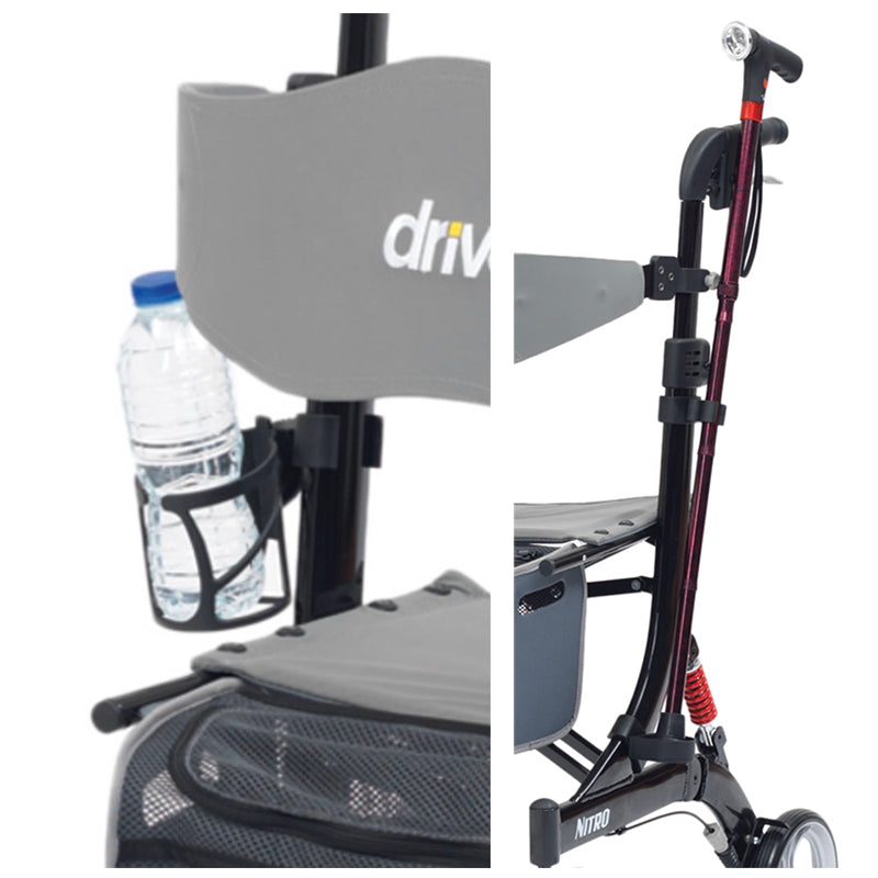 Nitro Accessory Pack includes a Bottle Holder and Cane Holder. The bottle holder keeps drinks safe and close to hand and the stick holder allows a walking stick or crutch to be stored on a rollator when not in use.
