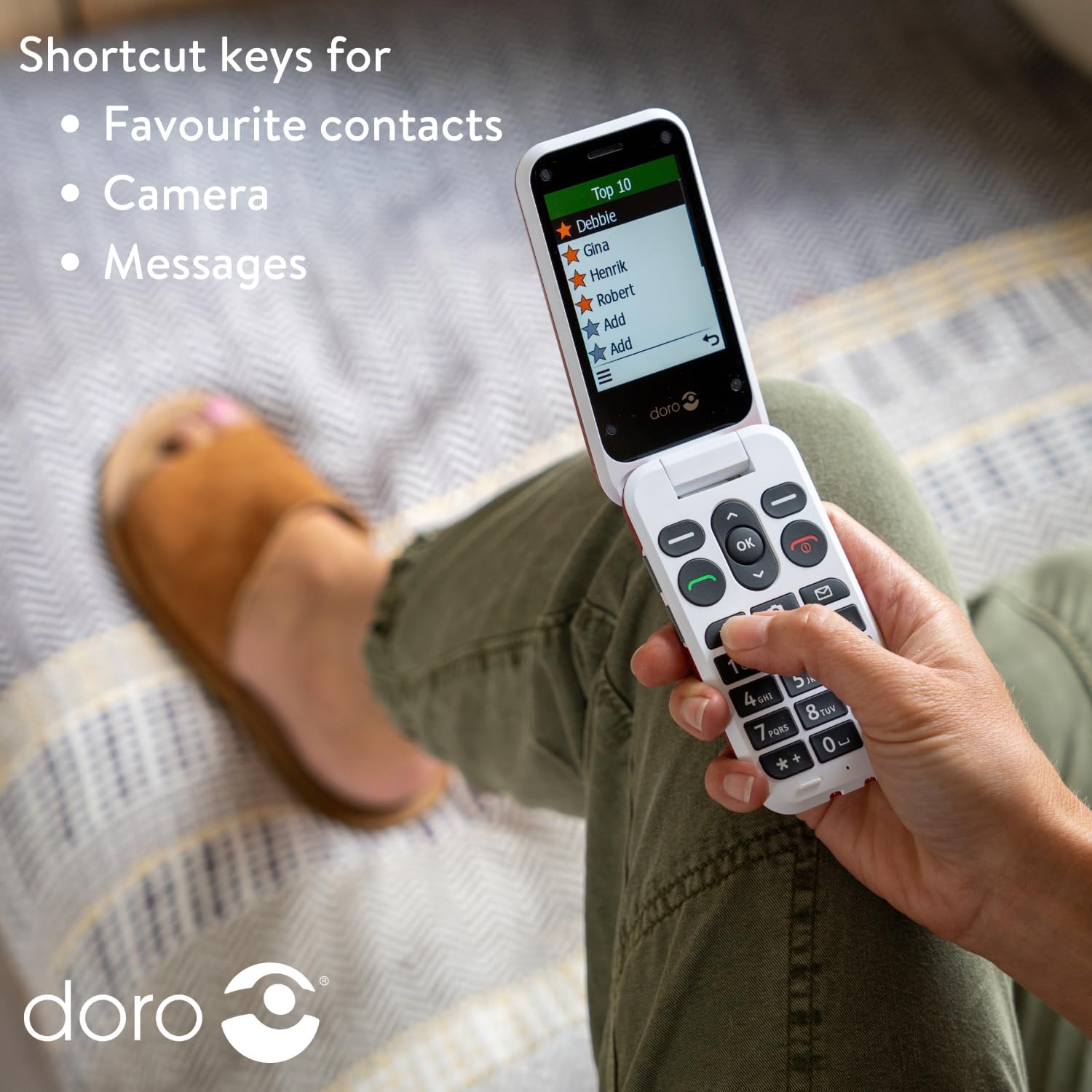 In the case of an emergency the built-in Doro Secure Button can send an emergency SMS to selected contacts and then calls them one by one for added reassurance.