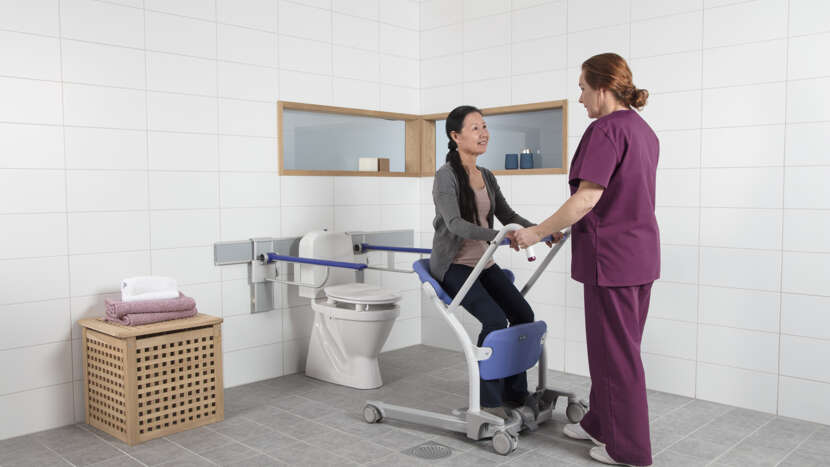 The Sara Stedy allows a lone caregiver to provide support for a patient when going from a seated position to a standing position. The easy-to-use device allows the patient more mobility whilst also protecting the caregiver from straining injuries.