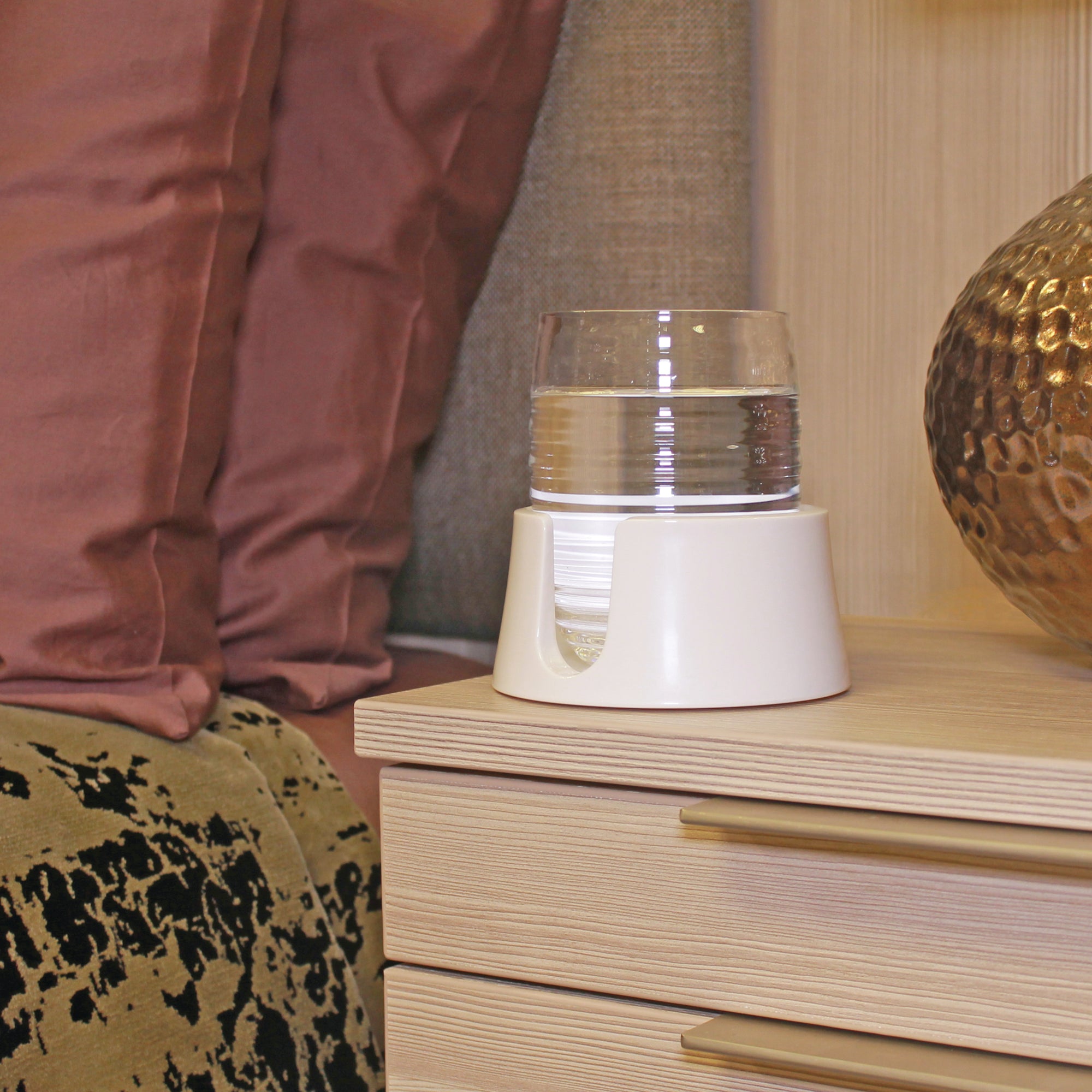 The TableCoaster includes a removable insert to hold smaller cups (up to 70mm wide) and features a slot for mug handles, ensuring a snug fit. The unique base acts like a reusable adhesive, keeping your drink in place without damaging surfaces. The low profile wall is designed to redirect any knocks downwards and so preventing tipping and allowing drinks to be kept upright.