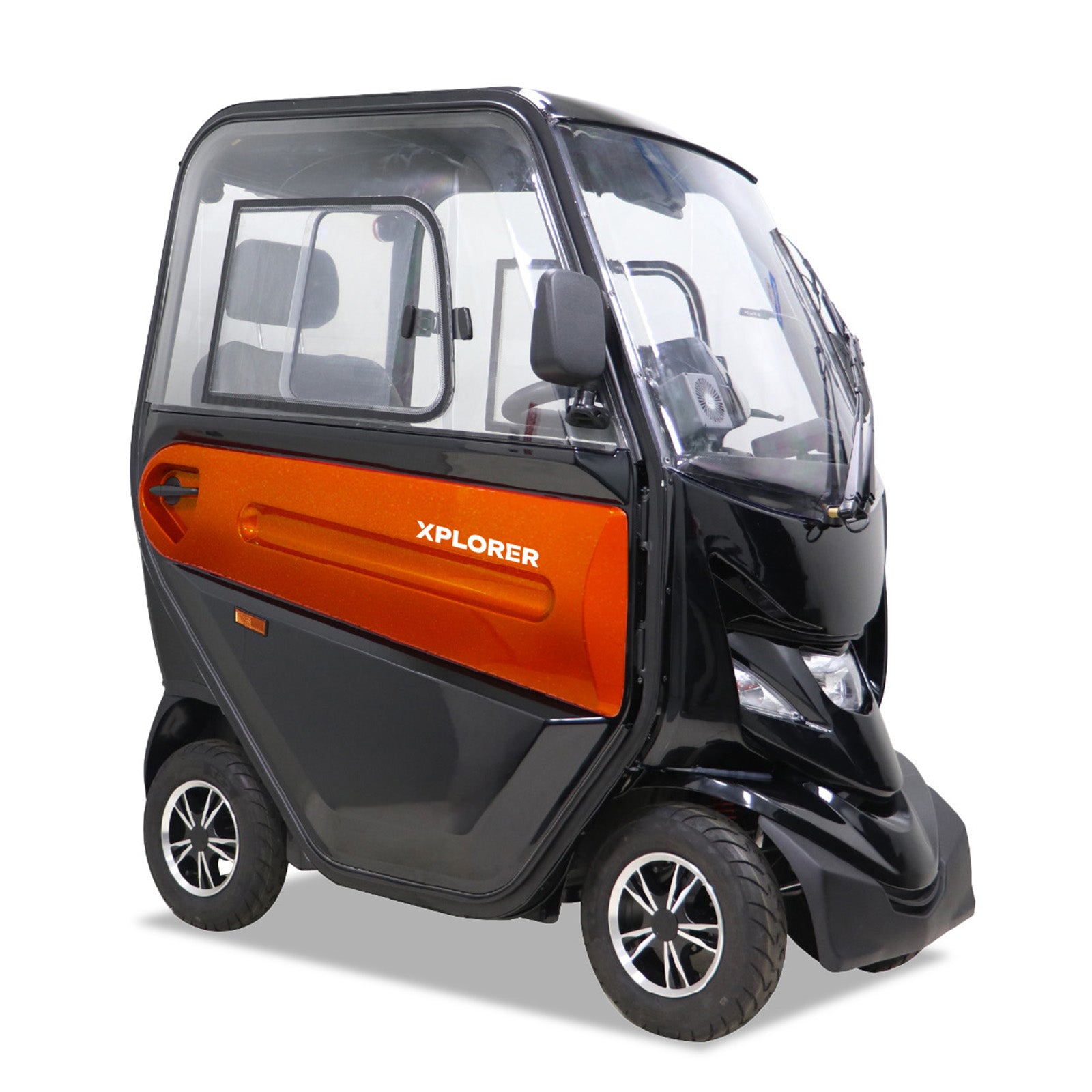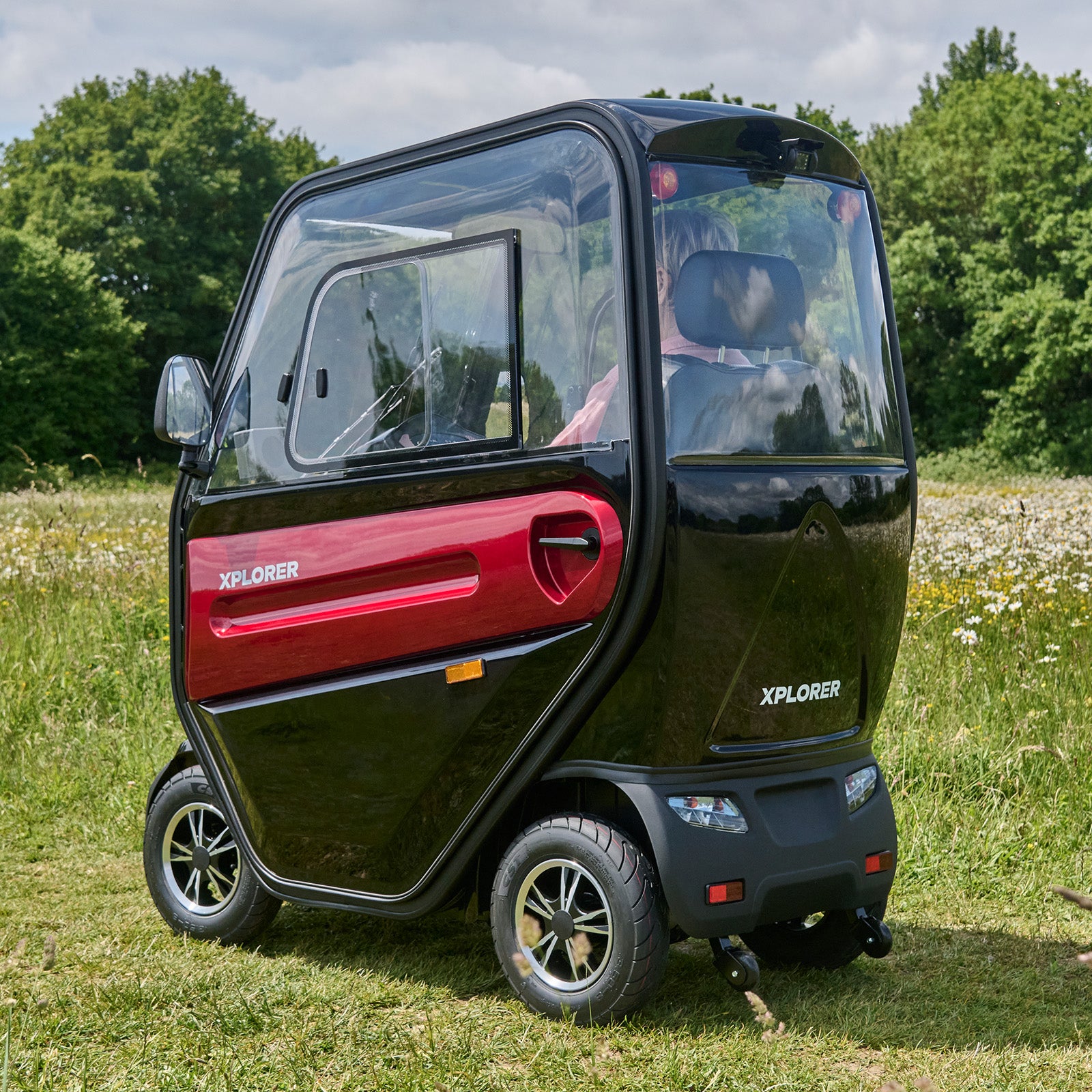 The Xplorer Mobility Scooter is a premium road-going scooter with a fully enclosed cabin for all-weather comfort. It offers a 20 or 40 mile range, 8 mph top speed, full suspension for on/off road use, heater, lights, rear camera, easy controls and delta handlebars with digital display.