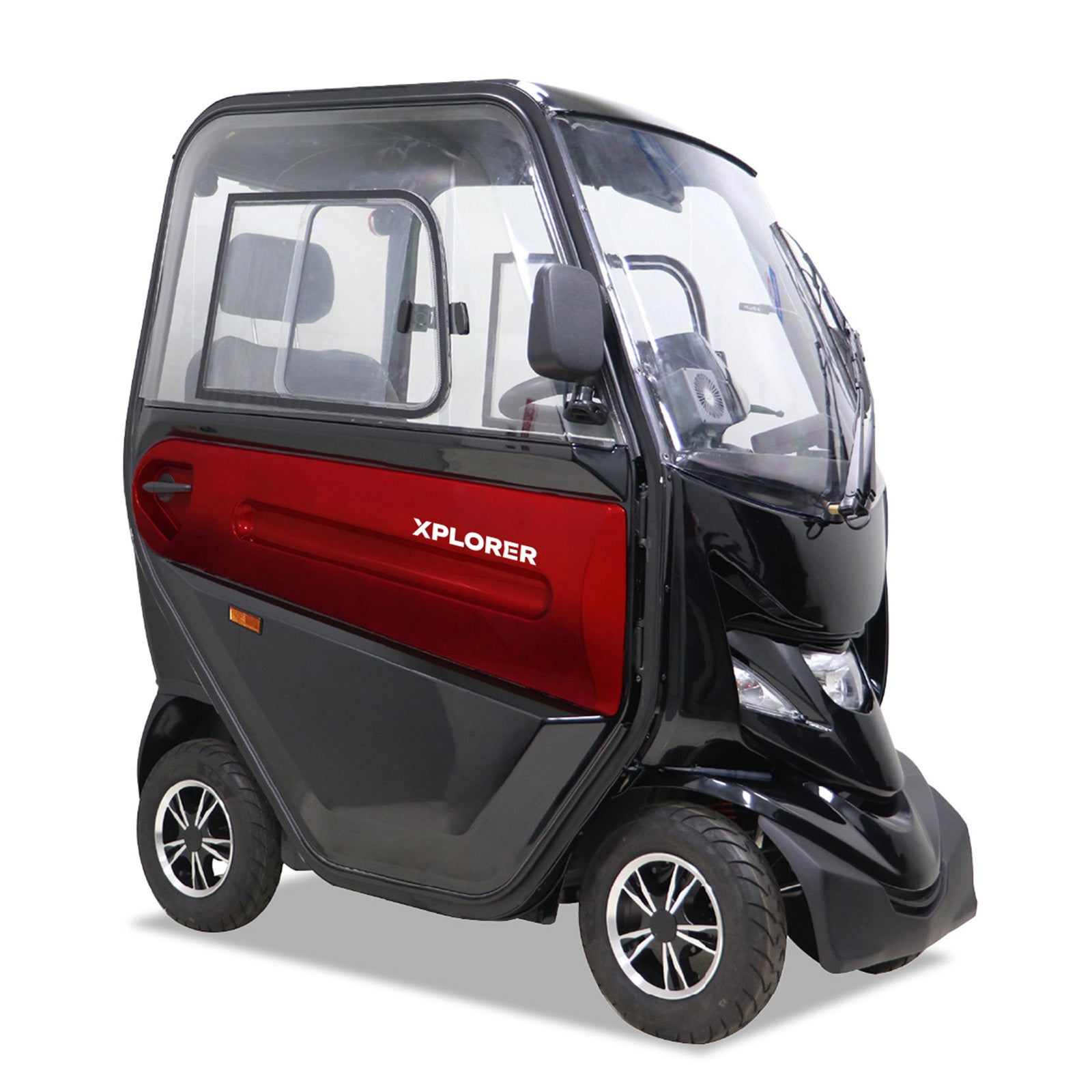 The Xplorer Mobility Scooter is a premium road-going scooter with a fully enclosed cabin for all-weather comfort. It offers a 20 or 40 mile range, 8 mph top speed, full suspension for on/off road use, heater, lights, rear camera, easy controls and delta handlebars with digital display.